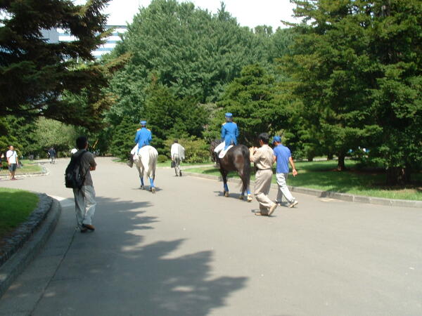 ◎道庁の広場で騎馬隊に会った。行進用の騎馬部隊だろう。池があったりして、札幌市民のオアシスとして存在価値のたかい公園である。