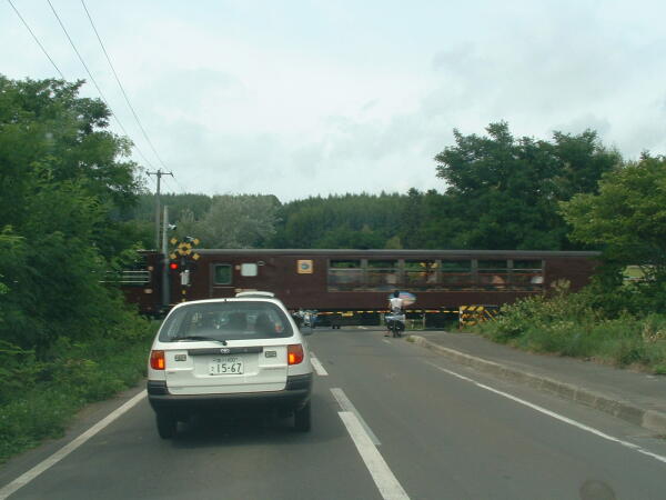 ◎めずらしく渋滞?、踏切でした。そこを行くのは名物列車ノロッコ号でした。フロントガラス越しに、思わずパチリでしたが、本当にノロイ。一度乗ってみたい。