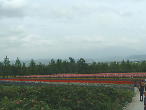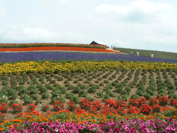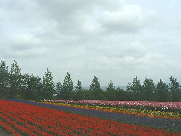 ◎色とりどりのサルビアが縞模様に咲いている。平地に咲いているのも綺麗だが、大地にすこしうねりがあって、それが富良野、美瑛のいいところだ。