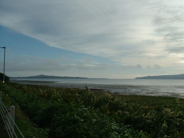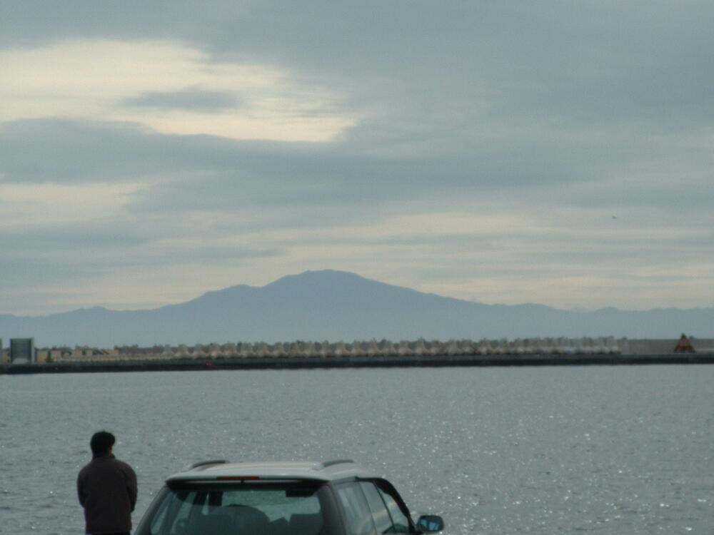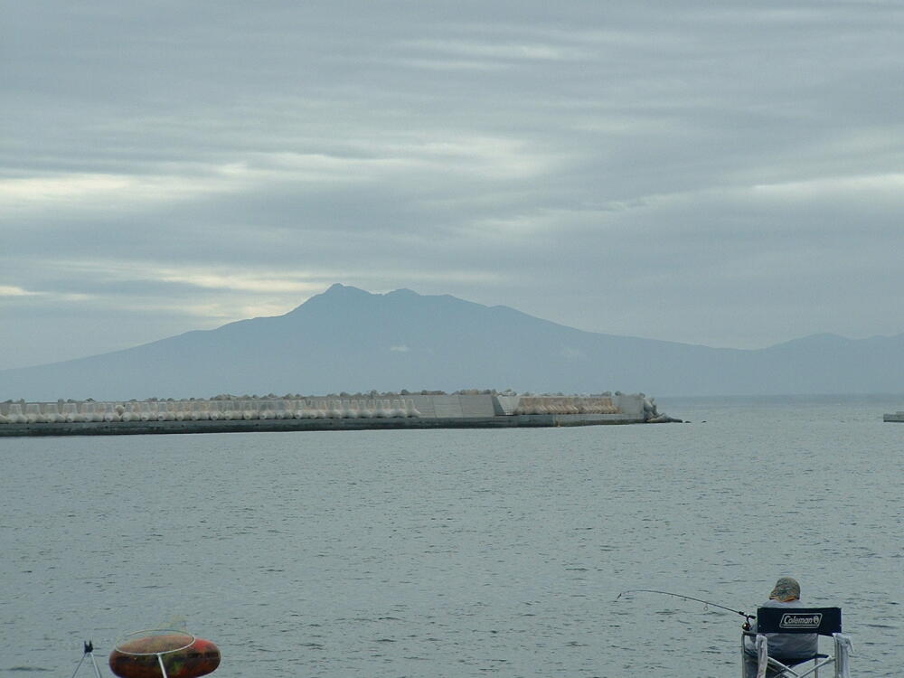 ◎斜里岳が望める、網走港の波止場に来て見た。すごし雲が掛っているが、天気予報は悪くない。とにかく、あの山から先が知床だ。