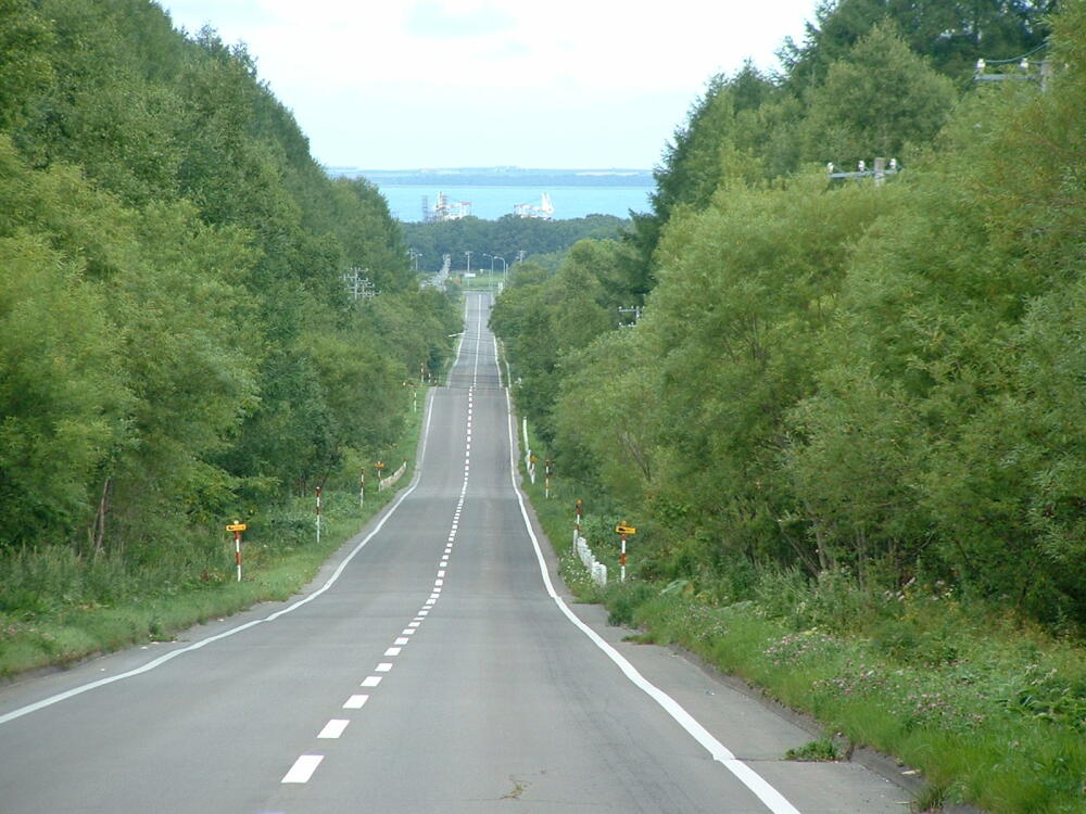 ◎能取湖を後に、峠を昇って行くと、バックミラーに写った景色は。北海道ならではのウネウネとした直線道路だ。ミラーを見なければ、こんな景色を見過ごすところだった。