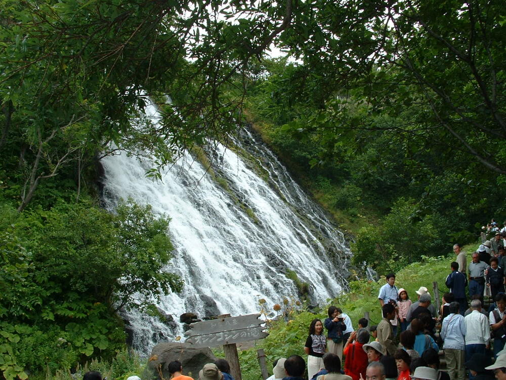 ◎知床半島の入口にある、オシンコシンの滝。滝のすごさよりも、人数の多さに驚く。さすがに土曜日だ、本土からの観光客と、地元から来る人で、ごった返している。