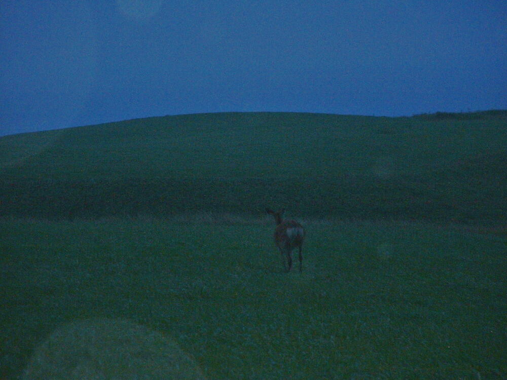 ◎襟裳はすっかり暗くなり、今日の寝床はどうしよう。草原に車を入れて、宿泊用意をしていたら、何か動物の気配がした。見れば、光る目がこちらを。鹿だ、やば、ほかへ行こう。